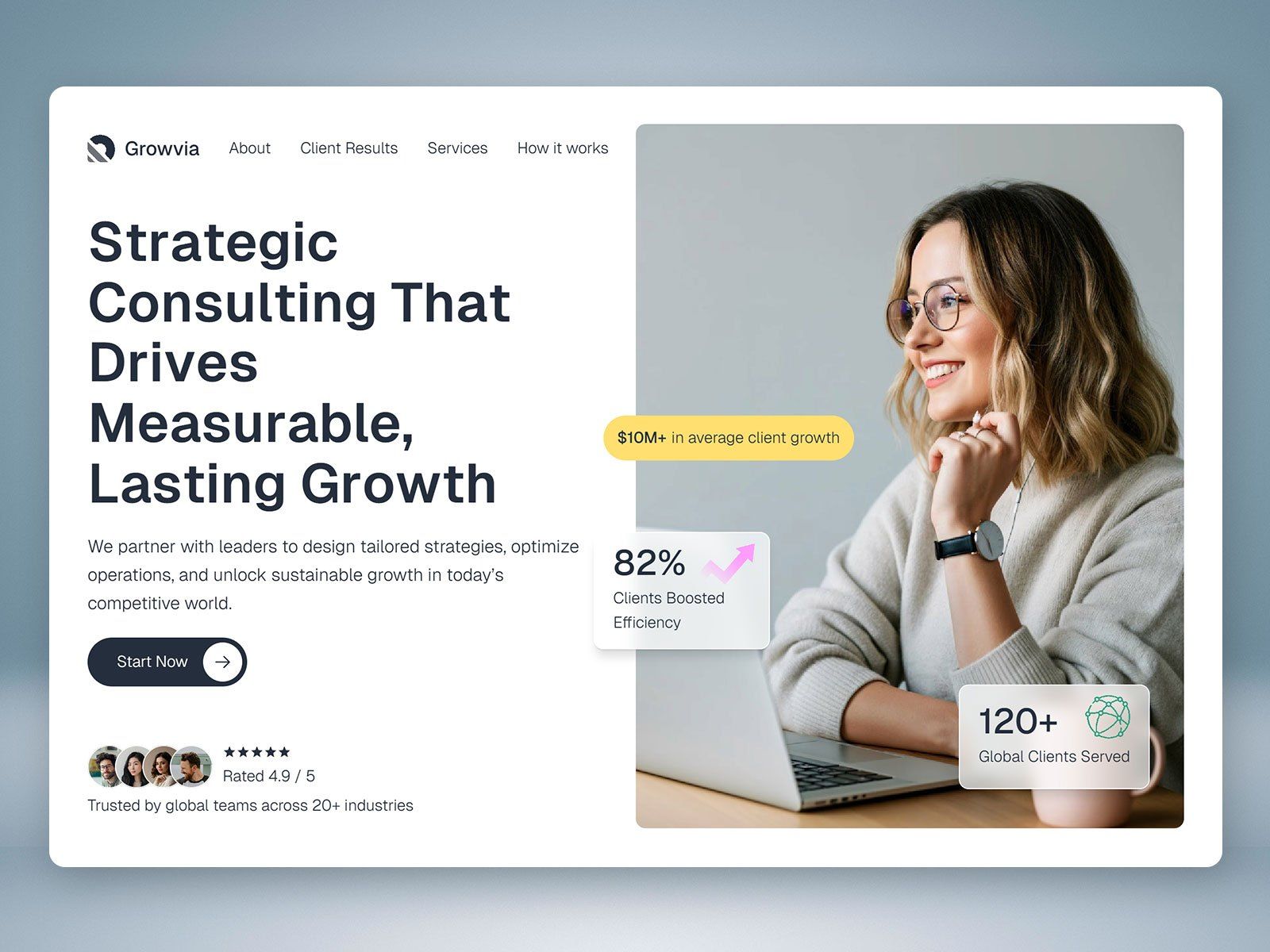 Growvia is a modern Framer template designed for business and strategy consultants, showcasing expertise and services in a professional layout.