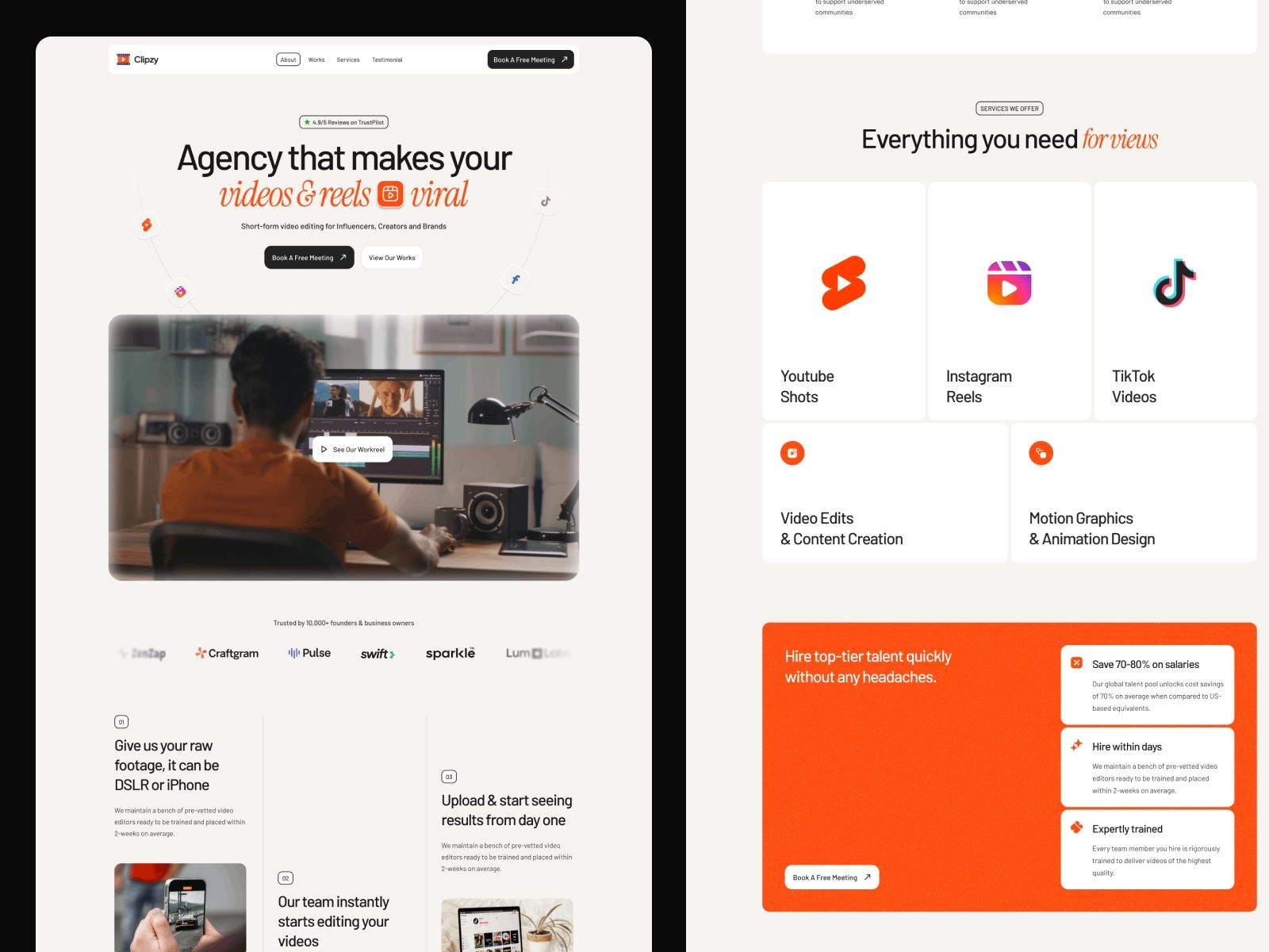 Clipzy is a modern, bold, and fast-loading Framer template for short-form video marketing agencies.